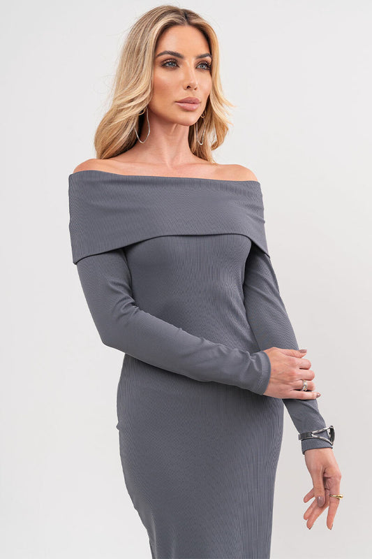 Off-Shoulder Ribbed Dress with Long Sleeves